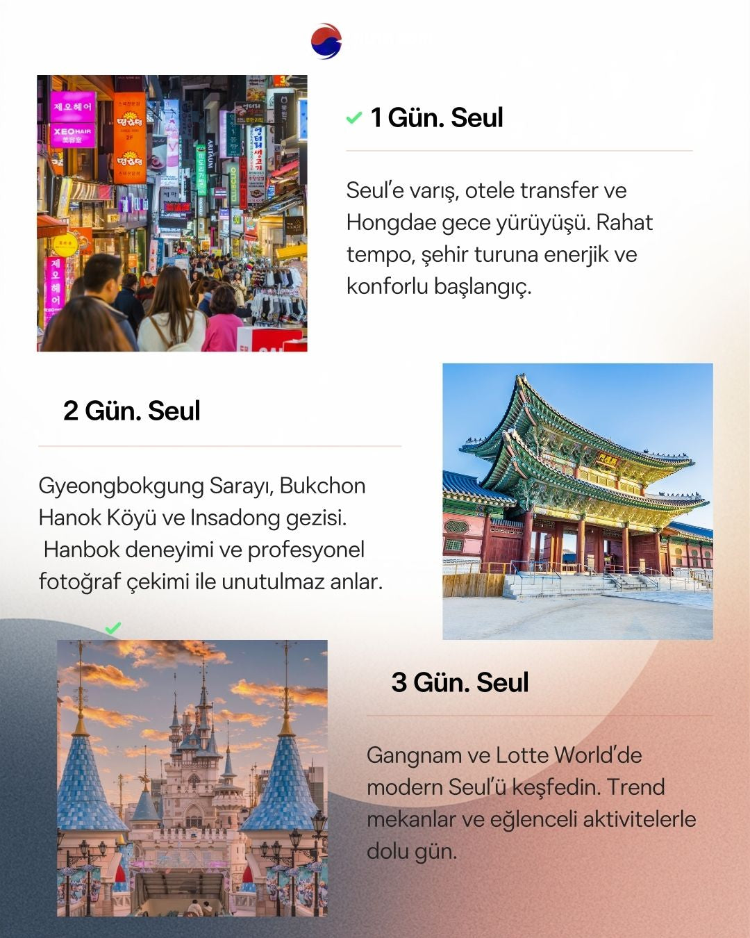 - Hanbok deneyimi, gece fotoğraf çekimi, alışveriş önerileri gibi ekstra seçenekler de sunulabilir.